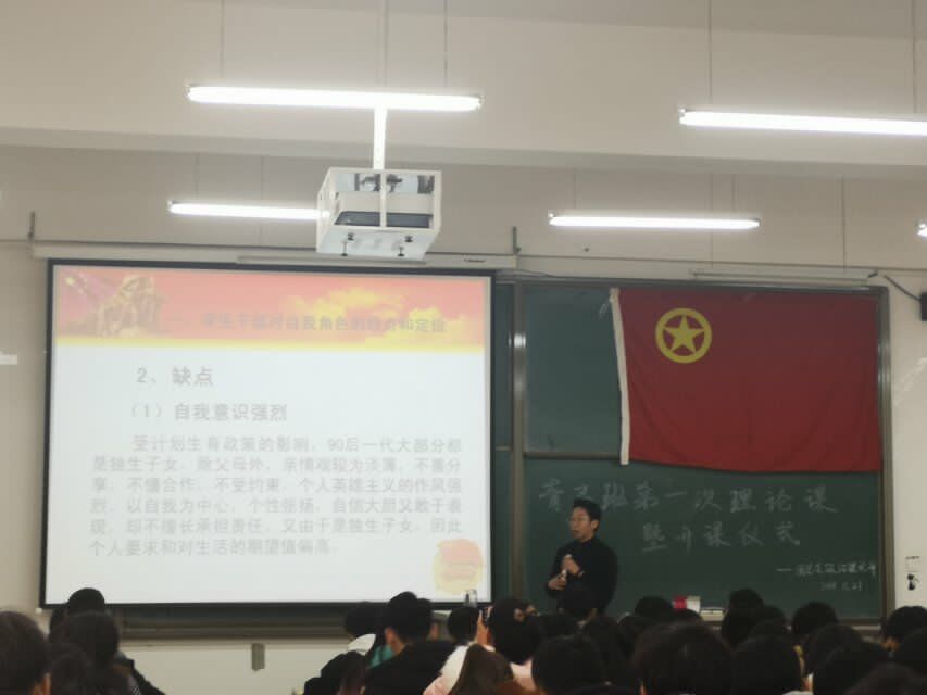 此次以“科学规划未来,描绘精彩人生"为主题的理论课由团总支书记刘新老师主讲。出席本次理论课的还有团总支副书记张恩佑,政治理论部部长班震。刘老师总结了90后学生干部的特点,然后详细阐述了学生干部自身应该如何正确定位,最后他教导学生干部应该如何走好学生干部之路。