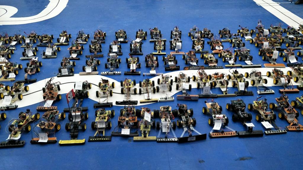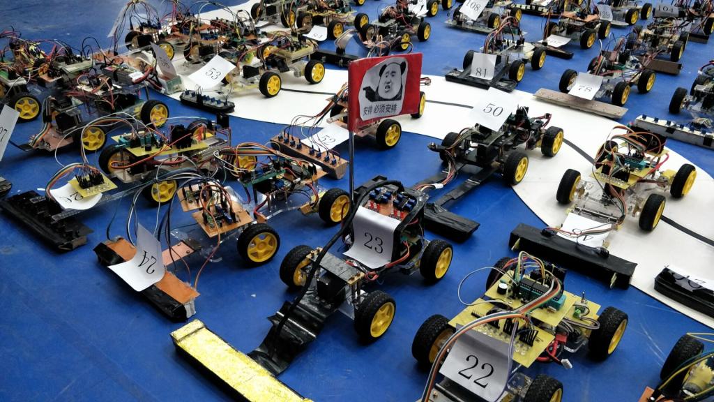 周日上午十点,决赛的号角打响!进入决赛的44支队伍早已蓄势待发。经过一晚上的通宵升级,各支队伍将小车速度调到极限,因为决赛竞争的是极致的速度,同学们摒弃保命的程序,将速度开到最大,来冲击比赛最终的1名一等、6名二等、13名三等。