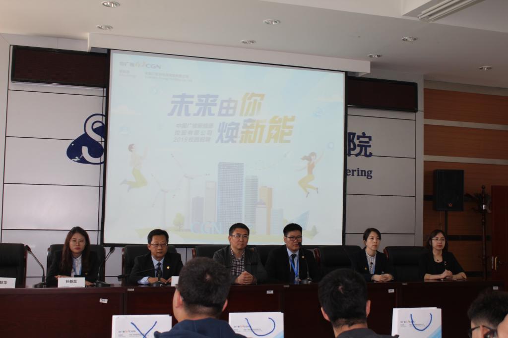 宣讲会上,中广核公司通过播放宣传片、PPT展示、面对面交流等方式向同学们介绍公司的概况、职业发展方向、人员需求以及选择该单位的理由等方面作了详细宣讲。活动中,在中广核公司实习和工作过的学长学姐站台为同学们解答疑问。