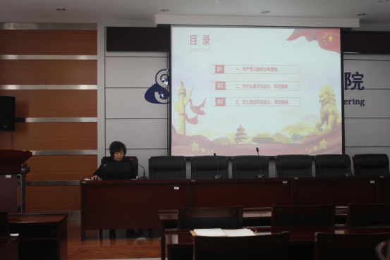 2019年11月14日下午两点半,信息工程学院全体教师在逸夫楼F302召开了“不忘初心,牢记使命”主题党课,本次党课由信息工程学院党总支书记崔桂梅教授担任主讲人。