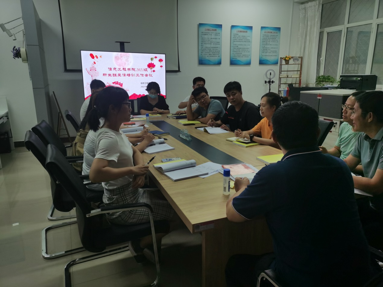 2021年7月15日下午,信息工程学院在逸夫楼D101举行2021级新生班主任培训工作会议,学工办刘吉宇老师主持会议,学院党委书记段志峰、学团办专职辅导员以及全体2021级新生班主任参加会议。