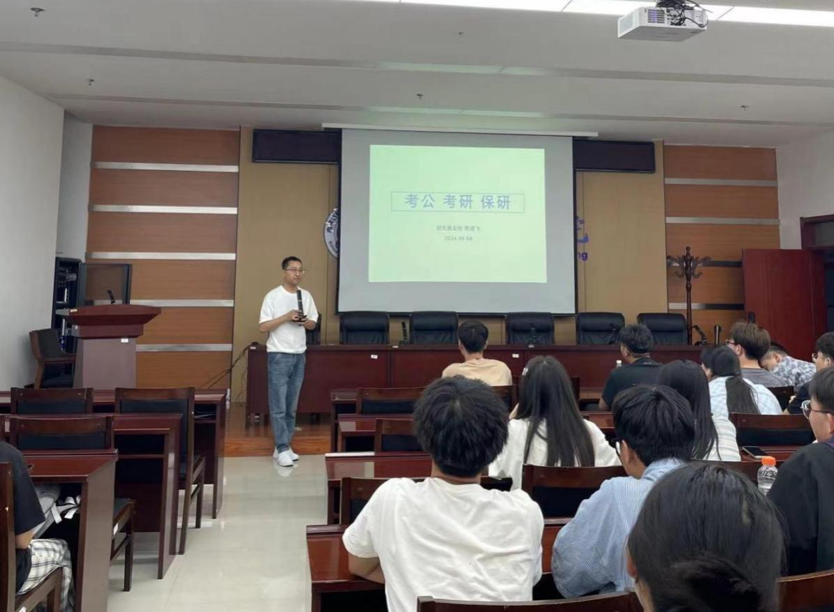 为更好的加深同学们对考公考研形势的了解,帮助同学们解决考研考公过程中遇到的困惑,5月8日,学院特邀请招生就业处贺凌飞老师和3位成功上岸的优秀学长在逸夫楼F302为大家进行考研考公经验分享交流会。学院辅导员李惠娟老师主持会议,近百名有意愿考公考研的同学参加会议。