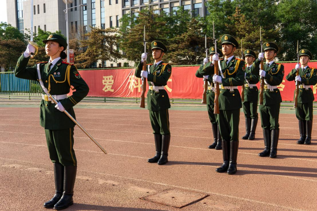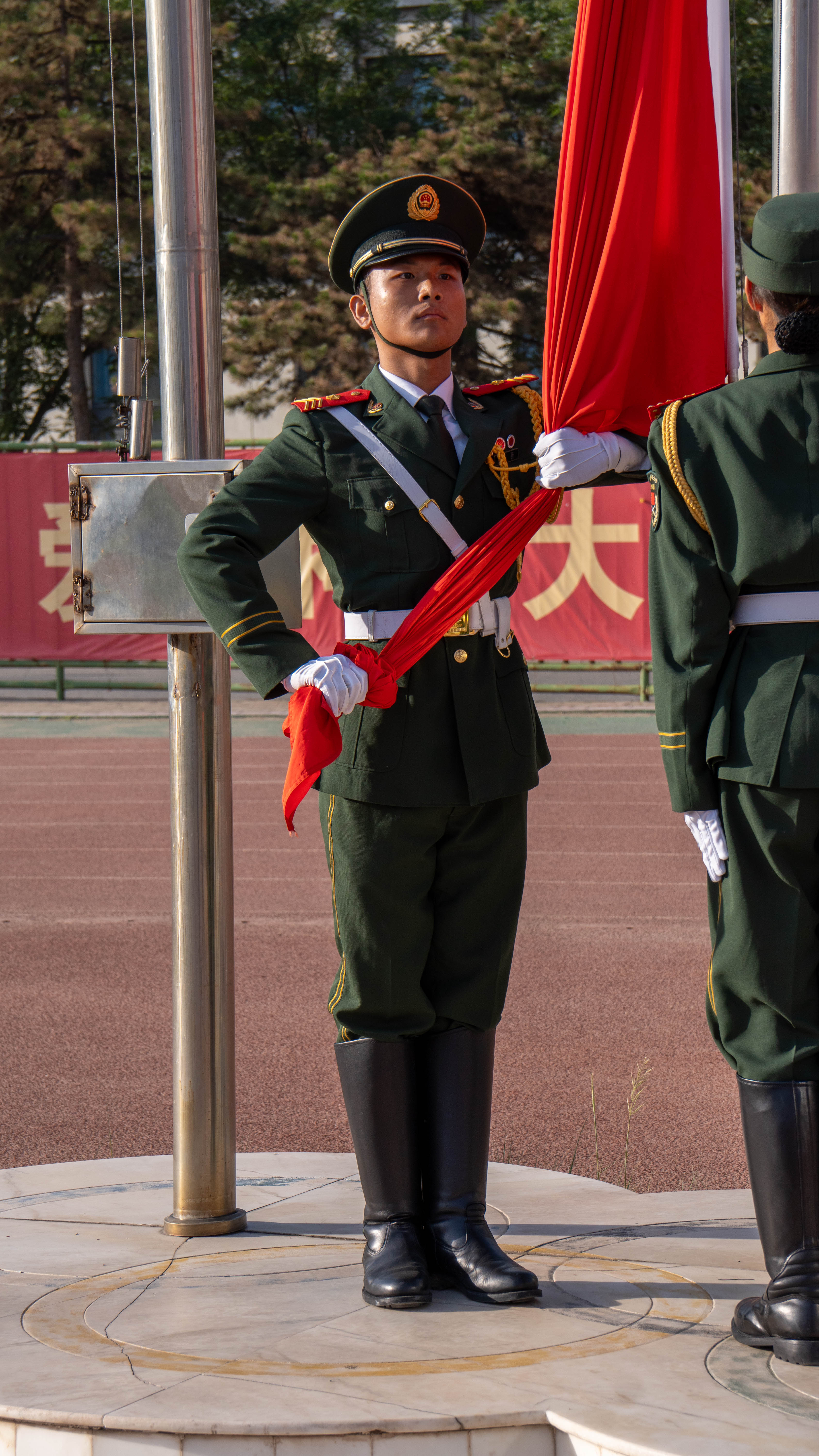 7时整,英姿飒爽的国旗班成员目光坚毅,迈着铿锵有力的步伐走向旗台,伴随着激昂雄壮的国歌声,鲜艳的五星红旗冉冉升起、迎风飘扬。