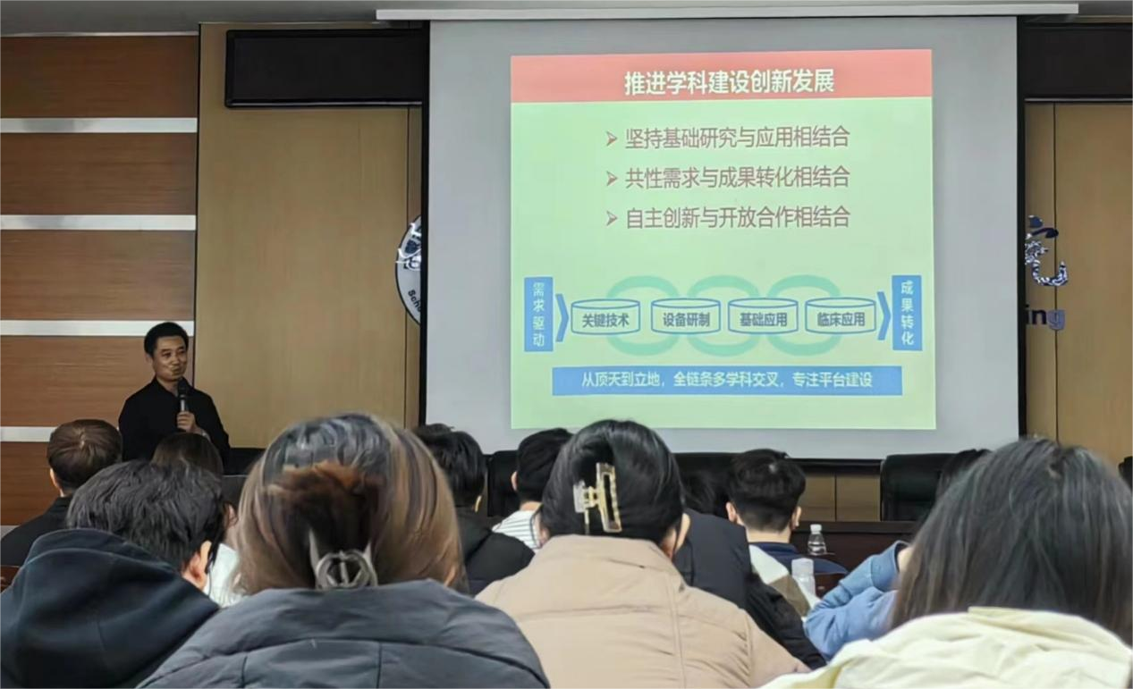 袁凯教授以“基于人工智能的成瘾行为预测及个体化脑调控”为题作了报告,从成瘾强戒渴求变化预测模型、网络成瘾高风险人群筛查模型、成瘾个体化调控策略的思考三个方面汇报,涉及药物成瘾的难题-复吸的精准预测、人工智能+神经影像为复吸预测提供新策略,并介绍了渴求的大脑回路机制与rTMS干预,分析本领域未来发展方向:个体化精准治疗,为师生们提供新的研究思路。袁教授表示可以通过坚持基础研究与应用相结合;共性需求与成果转化相结合;自主创新与开放合作相结合等方面推进学科建设创新发展。